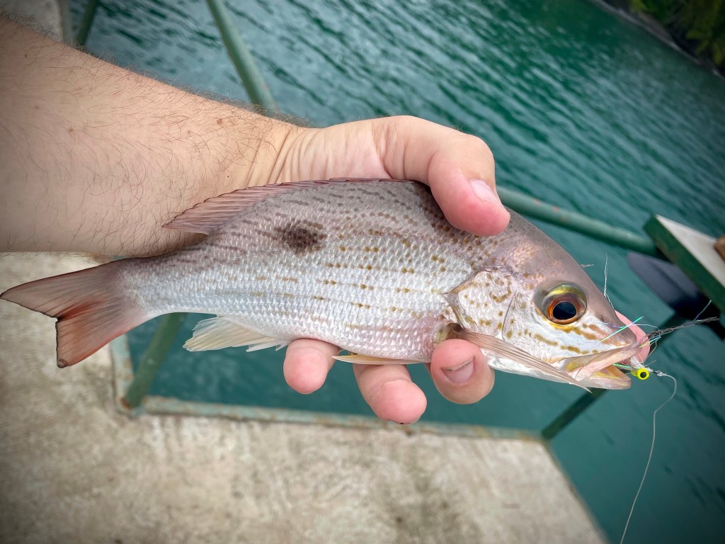 Rigged with an intermediate line, I made my way back to the pier and was greeted by clear skies and flat seas. I was determined to break the skunk and had no intention of returning to the cabin until I had.