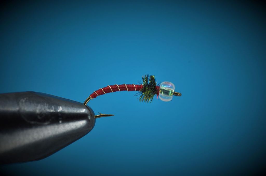 With that in mind, and trip to a popular Colorado tailwater slated for this past weekend, I decided it was time to try my hand at the Mercury Blood Midge. The creation of Pat Dorsey, the Mercury Midges are a series of midge patterns defined by the use of a silver-lined glass bead in place of a brass or tungsten bead head. Thought to imitate trapped gases escaping the thorax of the emerging midge, these glass-beaded imitations have proven capable of fooling even the most finicky of trout. Tied here in red, hence “blood” midge, numerous variations of mercury midge can be found with a cursory google search.